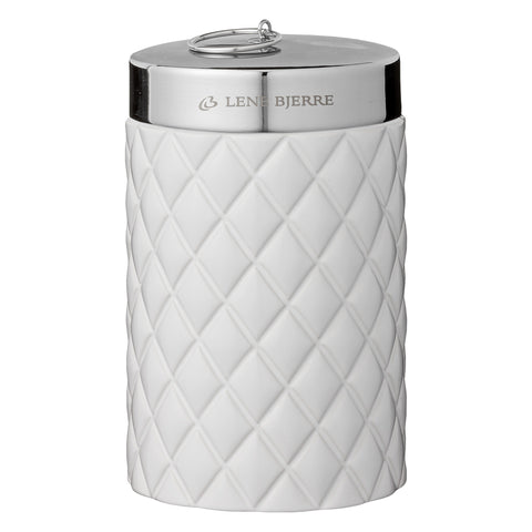 Eksklusiv hvit krukke i harlekin mønster med sølvlokk i sink fra Lene Bjerre. Portia krukken har et eksklusivt utseende og måler L9xB9xH14 cm.