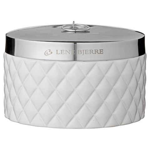 Eksklusiv hvit krukke i harlekin mønster med sølvlokk i sink fra Lene Bjerre. Portia krukken har et eksklusivt utseende og måler L15xB15xH9 cm.