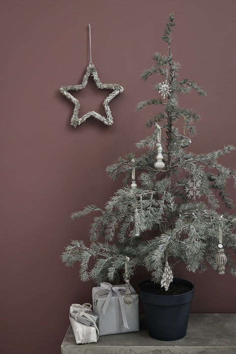Denne sjarmerende ornament tilfører et festlig preg med sitt klassiske design og skinnende sølv finish. Laget med detaljert håndverk og laget av polyresin, utstråler den vintage eleganse, mens den henger fra et rustikt snor. Perfekt for å dekorere juletreet ditt, denne ornamentet bringer en tidløs og magisk sjarm til sesongens dekorasjoner.